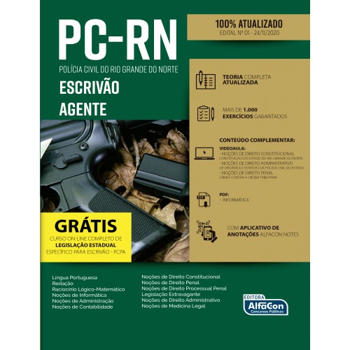 Para complementar o estudo e contribuir para a fixação do conteúdo, o livro Agente da Polícia Civil do Rio Grande do Norte traz, a cada capítulo, uma série de exercícios gabaritados de concursos anteriores. O material conta, ainda, com a tecnologia educacional AlfaCon Notes, uma ferramenta que auxilia no registro de anotações por meio de QR CODE, e código de acesso, que permite ao estudante ter acesso a vídeo aulas e materiais exclusivos para ampliar seus estudos