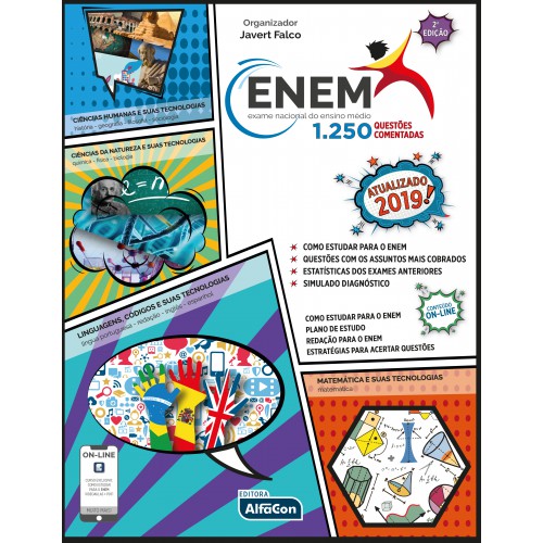 O ENEM, Exame Nacional do Ensino Médio, está presente na vida dos estudantesbrasileiros há mais de duas décadas e, de lá para cá, sua importância é semprecrescente, como mostra o número de alunos inscritos e o número de Universidadesque o utilizam para avaliação dos seus novos estudantes. As inúmeraspossibilidades garantidas pelo ENEM atraem o interesse de jovens e adultosque buscam conquistar uma vaga no curso superior desejado, de concluir oensino médio, participar de programa de bolsas e financiamentos que outilizam como referência.Pensando nisso, a Editora AlfaCon reuniu profissionais especialistas comgrande experiência em ENEM e trouxe para você esta obra que incluiquestões dos últimos 7 anos de prova, incluindo as do ENEM 2018. Sãomais de 1250 questões resolvidas e comentadas. As novidades nãoparam por aí!O ENEM Questões 2019 AlfaCon também traz: Informações gerais sobreo exame; Como Funciona o ENEM; Interação Online (QRcode), tudocom design inovador e linguagem didática, de fácil assimilação. Aindaoferece um CURSO ONLINE EXCLUSIVO: COMO ESTUDAR PARA OENEM, que ensina algumas estratégias de estudo, dicas para resolução dequestões, processos que levam você a ganhar tempo e aproveitar mais suashoras de estudo.