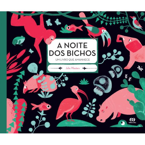 Com um projeto gra´fico primoroso, este livro exibe va´rios biomas (savana africana, taiga russa, floresta Amazo^nica, floresta europeia e fundo do mar) em diferentes horas do dia. Folhas de acetato azul-escuro e transparente ajudam a caracterizar cada momento. Assim o leitor descobre que, apesar da noite escura, nem todos os bichos dormem. Depois, com o nascer do sol, ele ve^ alguns animais surgir logo de manha~zinha e muitos outros va~o aparecendo conforme o dia avanc¸a. No final, esta~o todos os animais (mais de cem!) com os respectivos nomes para que a crianc¸a brinque de localiza´-los ao longo do livro.