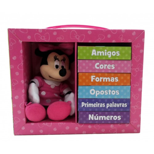 Aprender ficou mais divertido para as crianças com a ajuda desta Minnie fofinha de pelúcia e dos seis livrinhos cheios de lindas ilustrações.