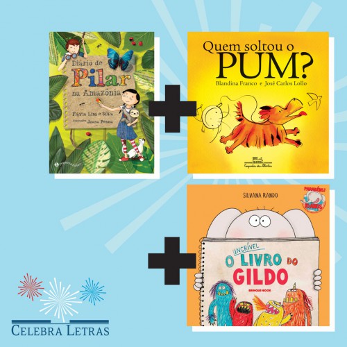 "O Kit Celebra LetrinhaZ + Brinque Book contém os livros ""Quem soltou o Pum"", ""Diário de Pilar na Amazônia"" e ""O incrível livro do Gildo"".