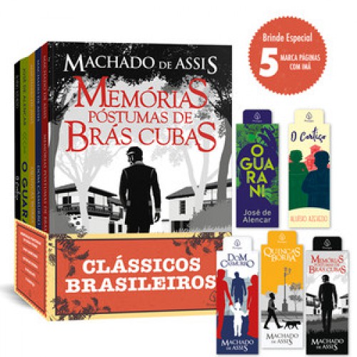 Seleção de grandes clássicos da literatura brasileira dos autores: Machado de Assis, José de Alencar e Aluísio Azevedo. O kit é composto pelos livros Dom Casmurro, Quincas Borba, Memórias Póstumas de Brás Cubas, O Guarani e O cortiço e cinco marca páginas.