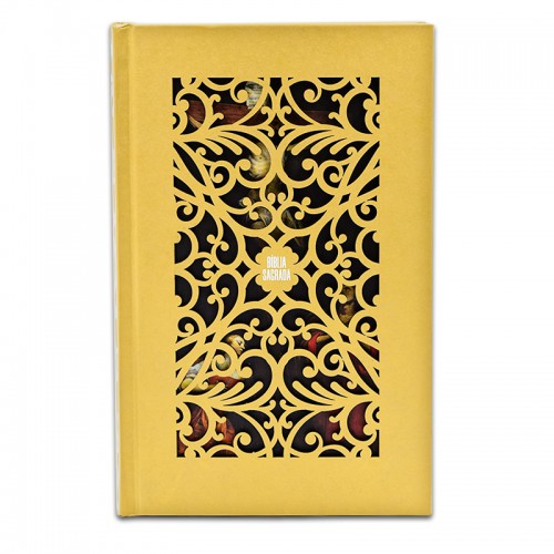 Com estilo que remete ao barroco mineiro, essa Bíblia tem capa dura dourada e vazada, que permite observar, através dela, o sacrifício que nos trouxe a salvação.