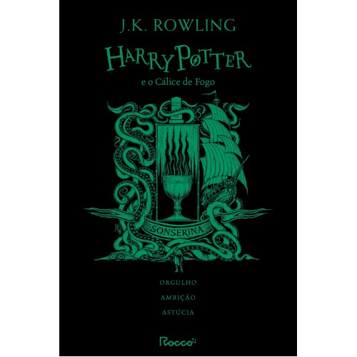 Harry Potter e o Cálice de Fogo personalizado da Casa Sonserina em capa dura, com pintura trilateral e fitilho. Os livros dessa edição trazem conteúdo editorial extra sobre cada casa, perfil de J.K. Rowling e curiosidades.