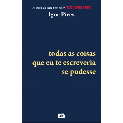 O autor nacional de ficção mais lido em 2020, Igor Pires lança o quarto livro da série Textos cruéis demais para serem lidos rapidamente. Em Todas as coisas que eu te escreveria se pudesse, Igor fala sobre amor, amar e deixar ir, ser intenso e abraçar a sua intensidade. Sobre dizer e sentir tudo sem gaguejar. Sobre enfrentar a dor e aceitar que a cura é um processo contínuo, imprevisível, não linear.
